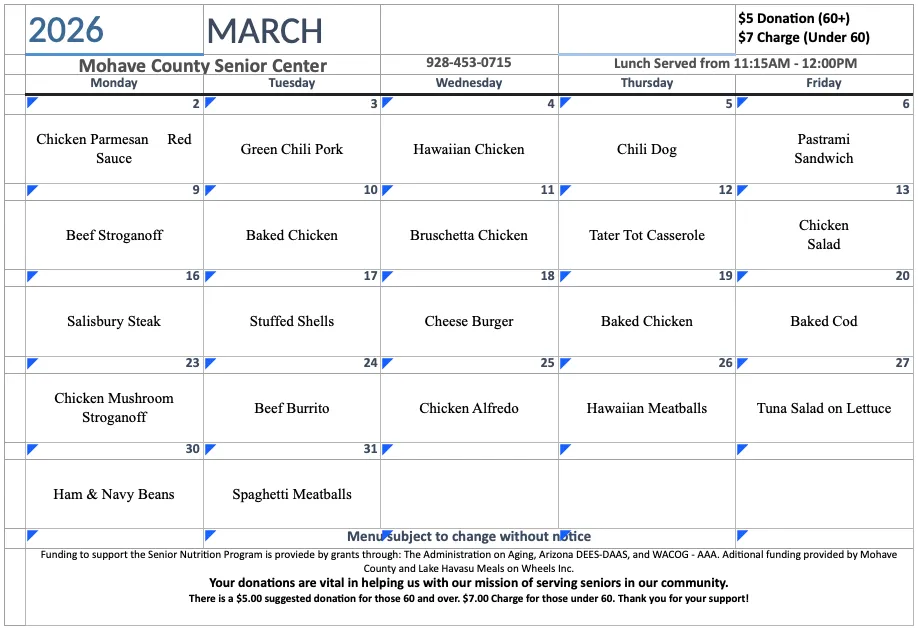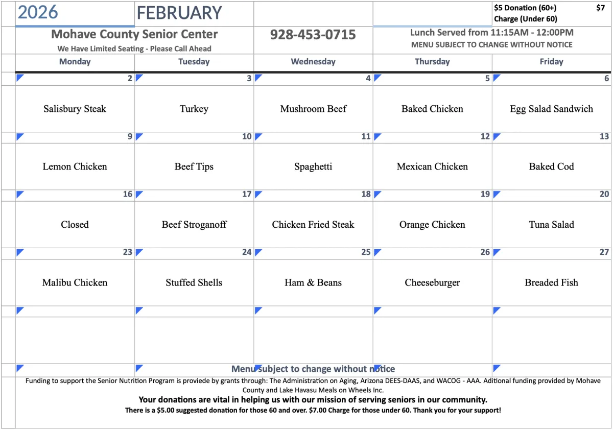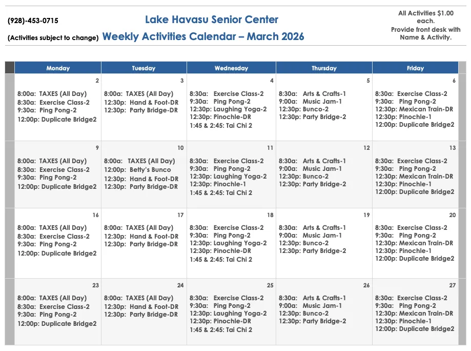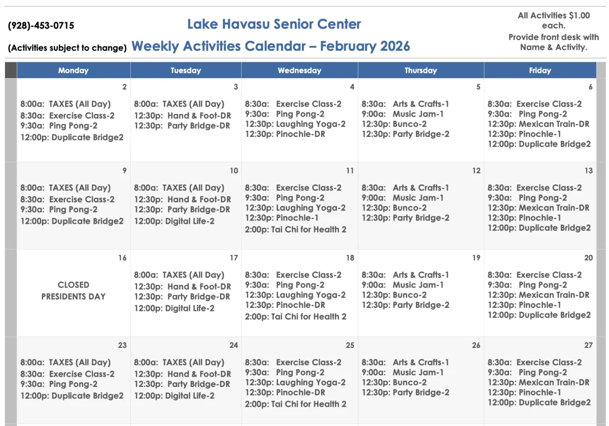 Please Note: While we strive to maintain a consistent schedule of activities, holidays may affect our weekly events. To ensure your plans align with our updated schedule, we recommend contacting the Lake Havasu Senior Center at 928-453-0715 to confirm activities during holiday weeks. We appreciate your understanding and look forward to seeing you soon!