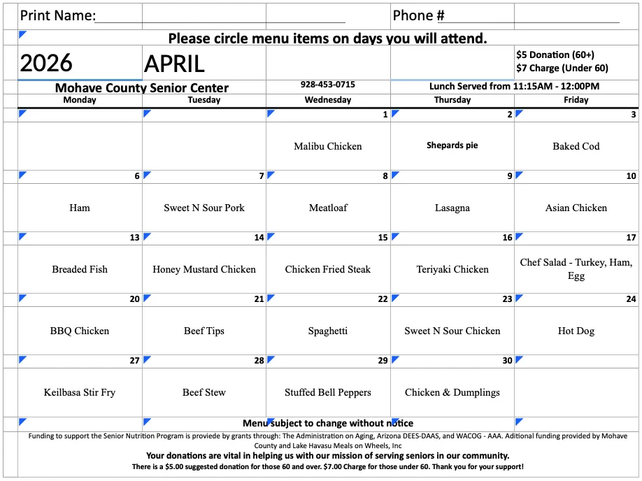 Please Note: While we strive to maintain a consistent schedule of activities, holidays may affect our weekly events. To ensure your plans align with our updated schedule, we recommend contacting the Lake Havasu Senior Center at 928-453-0715 to confirm activities during holiday weeks. We appreciate your understanding and look forward to seeing you soon!